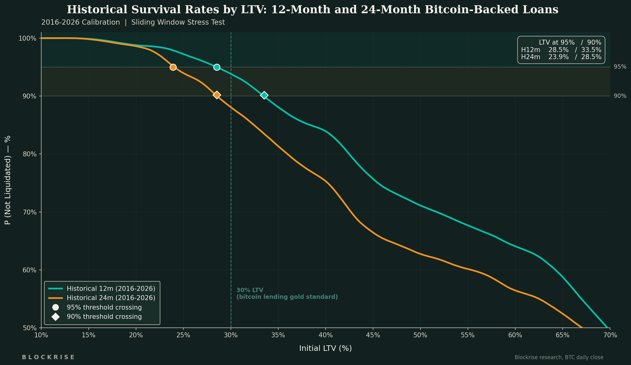 At 28.5%, 95% of all 12-month loans survived every historical Bitcoin market regime from 2016 to 2026.