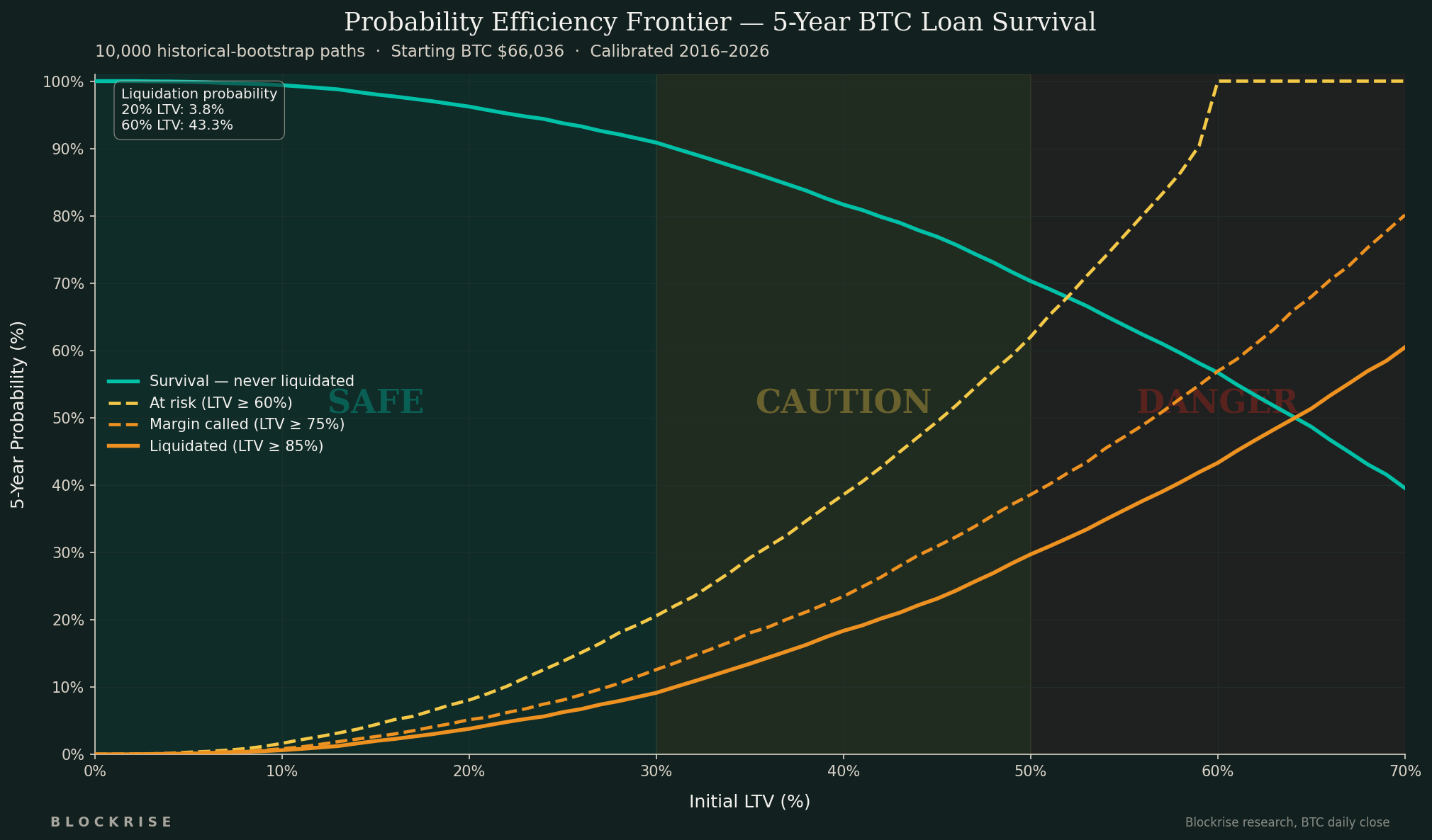 A Monte Carlo simulation of 10,000 Bitcoin price paths shows liquidation probability rising from 3.8% at 20% LTV to 43.3% at 60% LTV.