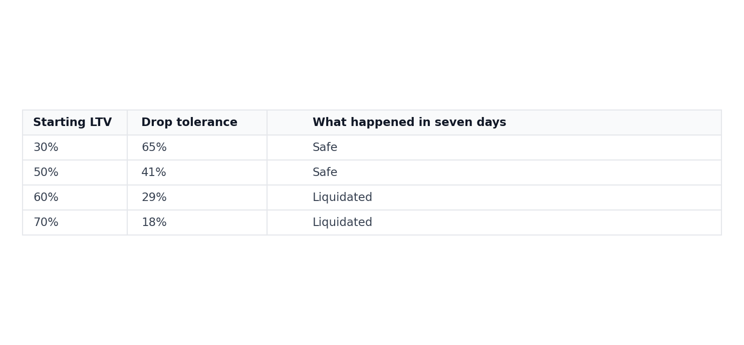 Borrowers at 60% LTV had just 29% buffer. A 33% drop in seven days erased it entirely, leaving only a few days to add collateral or face forced liquidation at the bottom.
