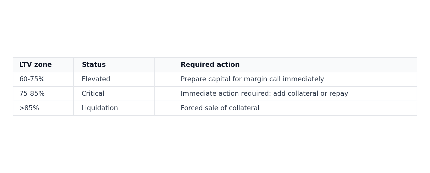 Calculate your response in advance. If your LTV reaches 75%, how much collateral must you add? How much must you repay? Know these numbers before the margin call arrives.