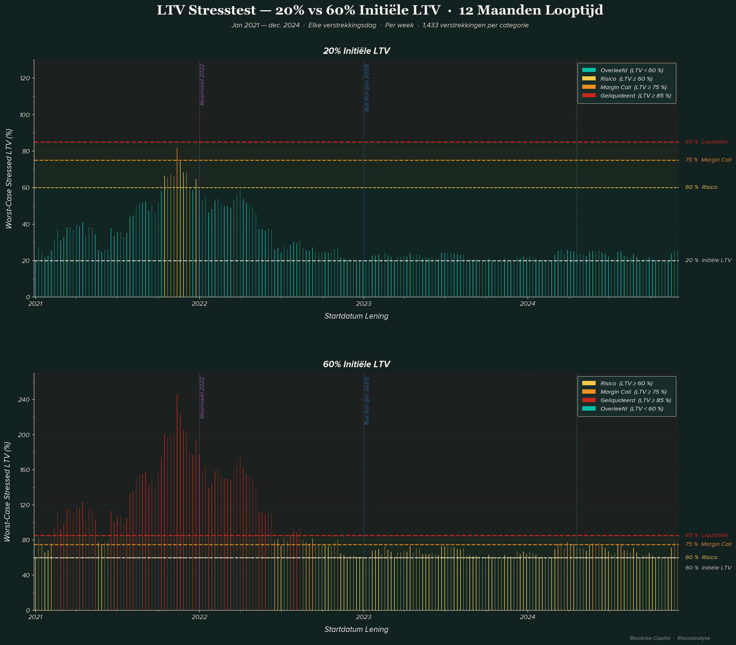 Dit onderzoek stresstestte dagelijkse leningverstrekkingen van januari 2016 tot maart 2026 over vier LTV-niveaus, waarbij het slechtste scenario werd gemeten over de volledige looptijd van elke lening.