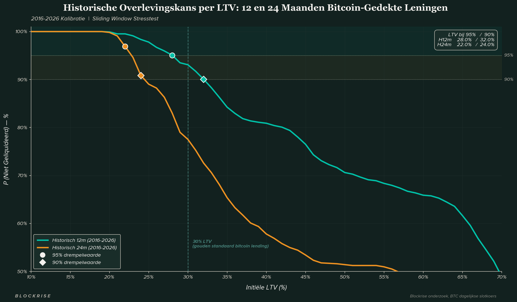 Historische overlevingscurves over alle marktomstandigheden van 2016 tot 2026 trekken een heldere lijn. Om 95% van alle eerdere leningverstrekkingen te beschermen, zou een kredietverstrekker de initiële LTV moeten beperken tot 28,0% voor 12-maandsleningen en 22,0% voor 24-maandsleningen — beide onder de drempels die gangbaar zijn in de markt. De 90%-overlevingsdrempel versoepelt de vereiste naar 32,0% en 24,0% respectievelijk.
