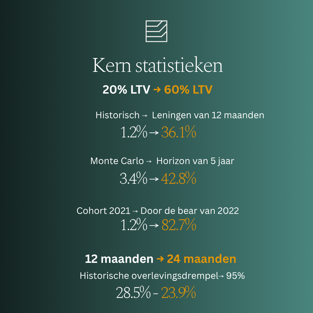 Historische overlevingscurves tonen aan dat een kredietverstrekker, om 95% van alle eerdere verstrekkingen te beschermen, de initiële LTV zou moeten beperken tot 28,5% voor 12-maandsleningen en 23,9% voor 24-maandsleningen, beide onder de drempels die vandaag gangbaar zijn in de markt.