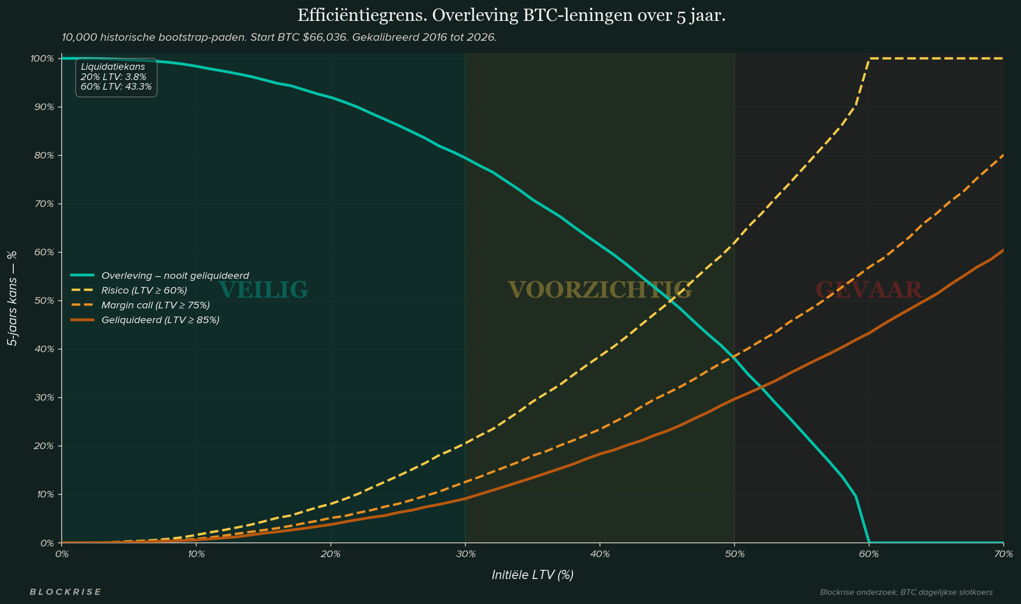 Een Monte Carlo-simulatie van 10.000 Bitcoin-prijspaden over een horizon van vijf jaar bevestigt en verdiept de historische bevindingen. Bij een LTV van 20% bij verstrekking heeft een lening een kans van 3,8% op liquidatie over vijf jaar. Bij 60% LTV klimt dat cijfer naar 43,3%. De toename is niet lineair.